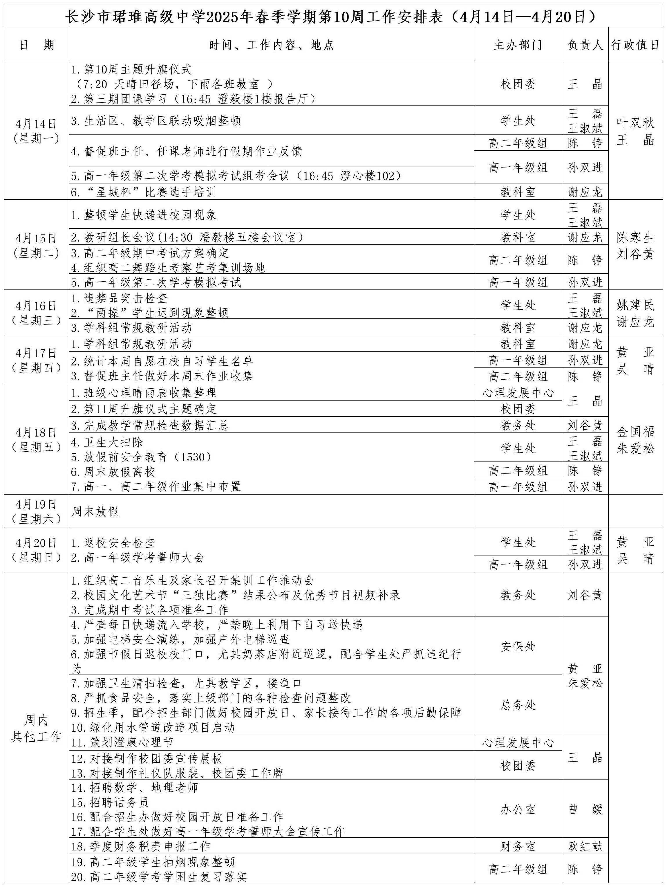 长沙市珺琟高级中学2025年春季学期第10周工作安排