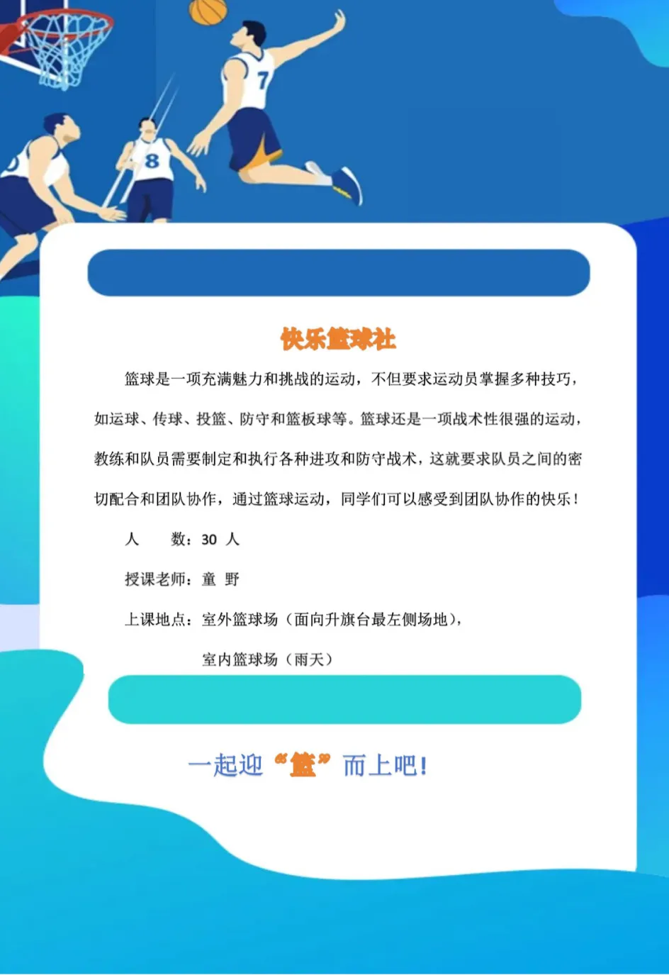篮球具有良好的综合健身作用,能够培育同学团结、协作、进取和拼搏的精神。快乐篮球社以《体育与健康》篮球教材为基础,课程内容由基本技术、简洁战术和教学竞赛三部分组成,坚持循序渐进和教学同步互动的教学方法。