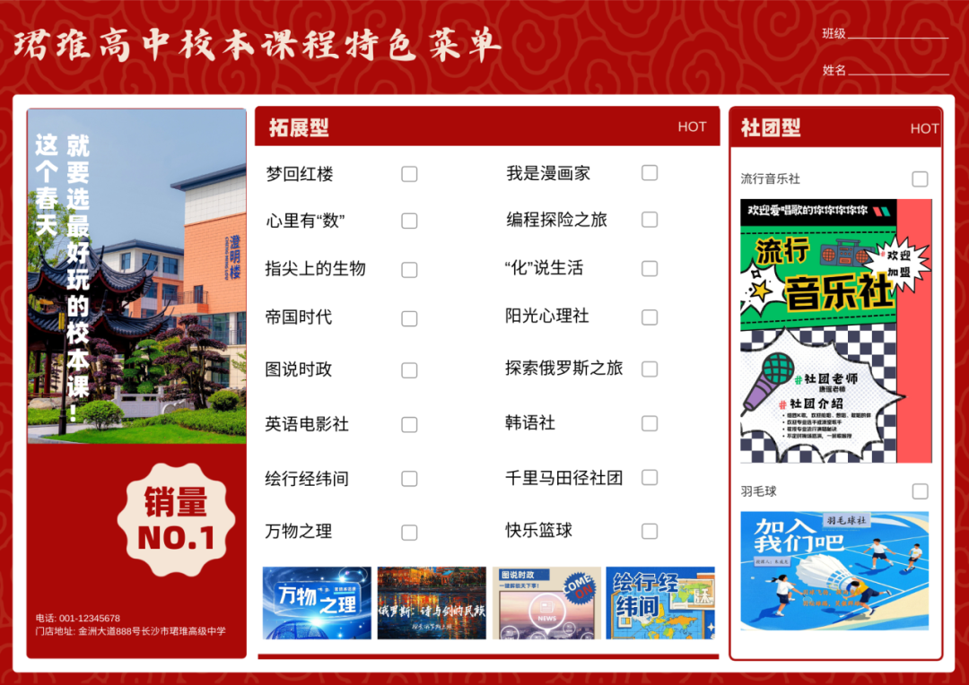 为进一步促进珺琟学子个性化发展,落实“双减提质”政策精神,完善“澄课程”体系,本学期,我校结合过往实施经验,进一步优化“菜单式”校本课程结构,共推出拓展型、社团型两大类,共18门校本课程。2月28日16:45,高一年级同学们纷纷涌入体育馆,向心仪的课程投递自己的申请书。