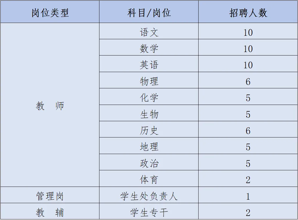 语文、数学、英语、物理、化学、生物、历史、地理、政治教师若干名。